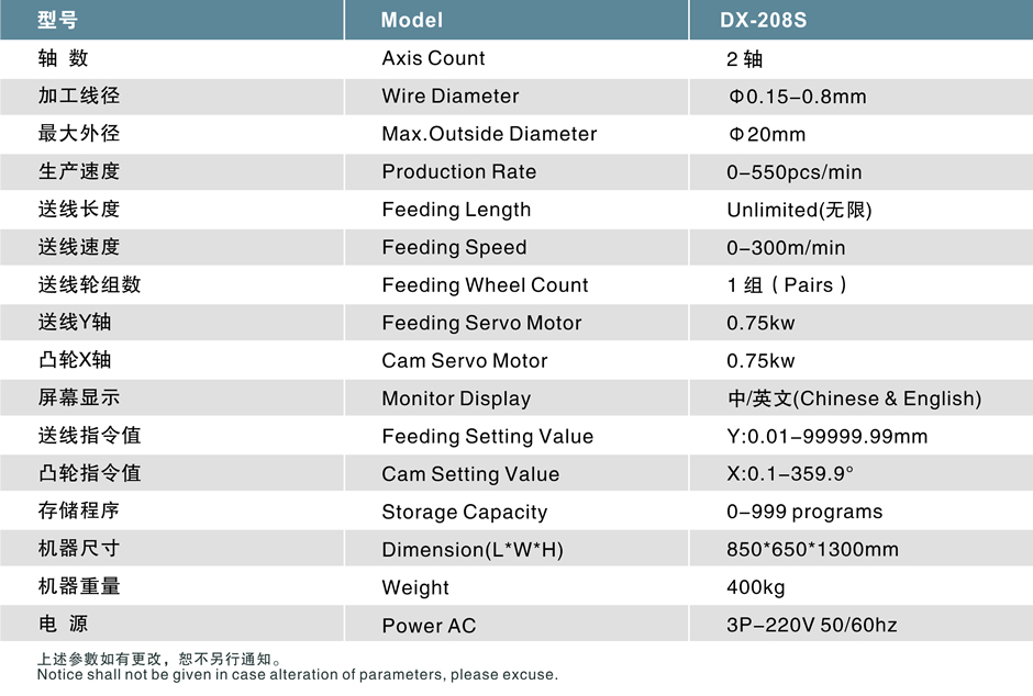 Machine Features: DX-208S compression spring machine is a 2-axis equipment consisting of wire feeding Y axis and cam X axis. It adopts Taiwan